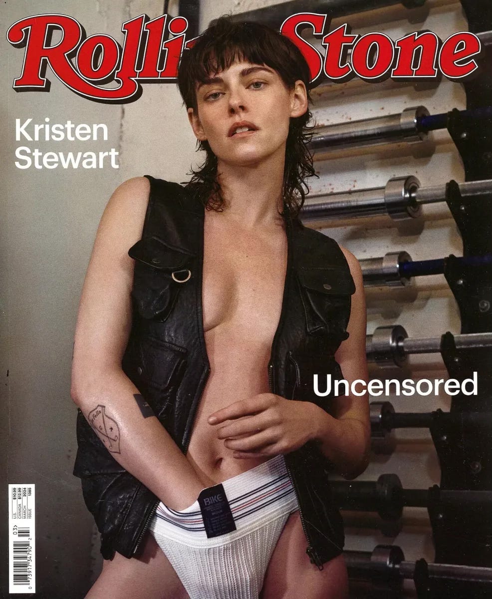Recently, Kristen Stewart’s Rolling Stone cover photo (below) received so much criticism for violating public expectations of female sexuality by wearing an open shirt and a jockstrap. For being “explicit” for having her hand in her pants. In an interview with Steven Colbert, she points out the societal double standard in it all by saying,