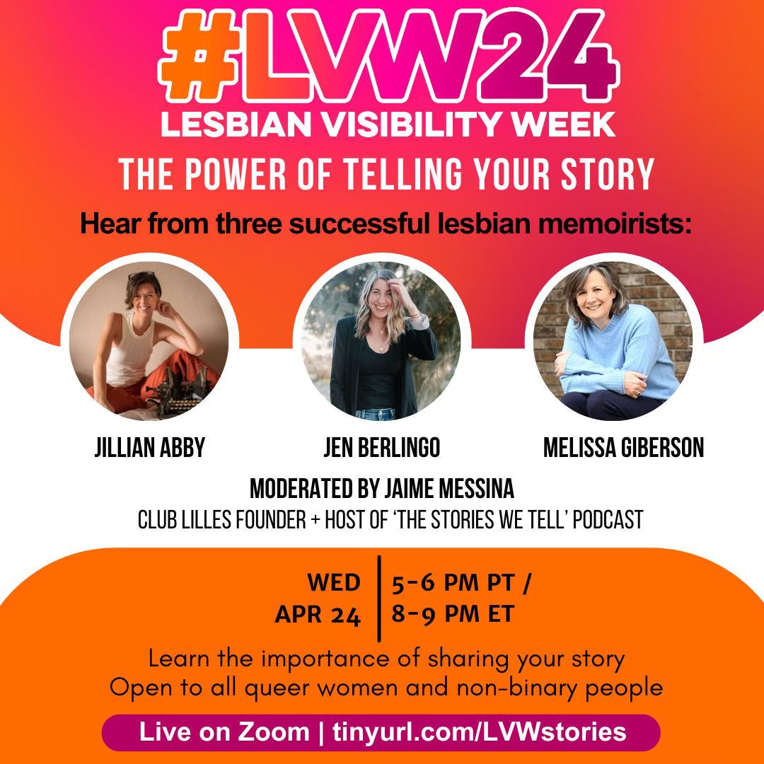 planning: an inspiring, free event for Lesbian Visibility Week, where I’ll be a member of a panel alongside two other queer award-winning memoirists, sharing the power of storytelling. Mark your calendar now, and join us on the evening of April 24. No registration required; all you’ll need to tune in is the Zoom link shown at the bottom of the graphic below: