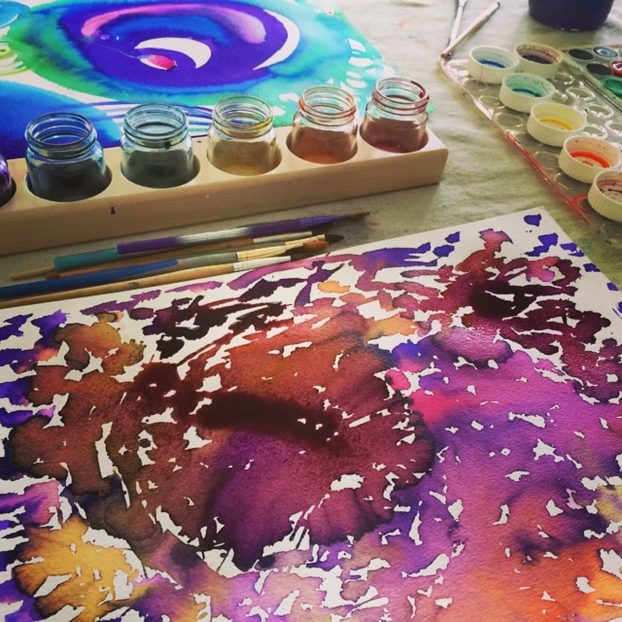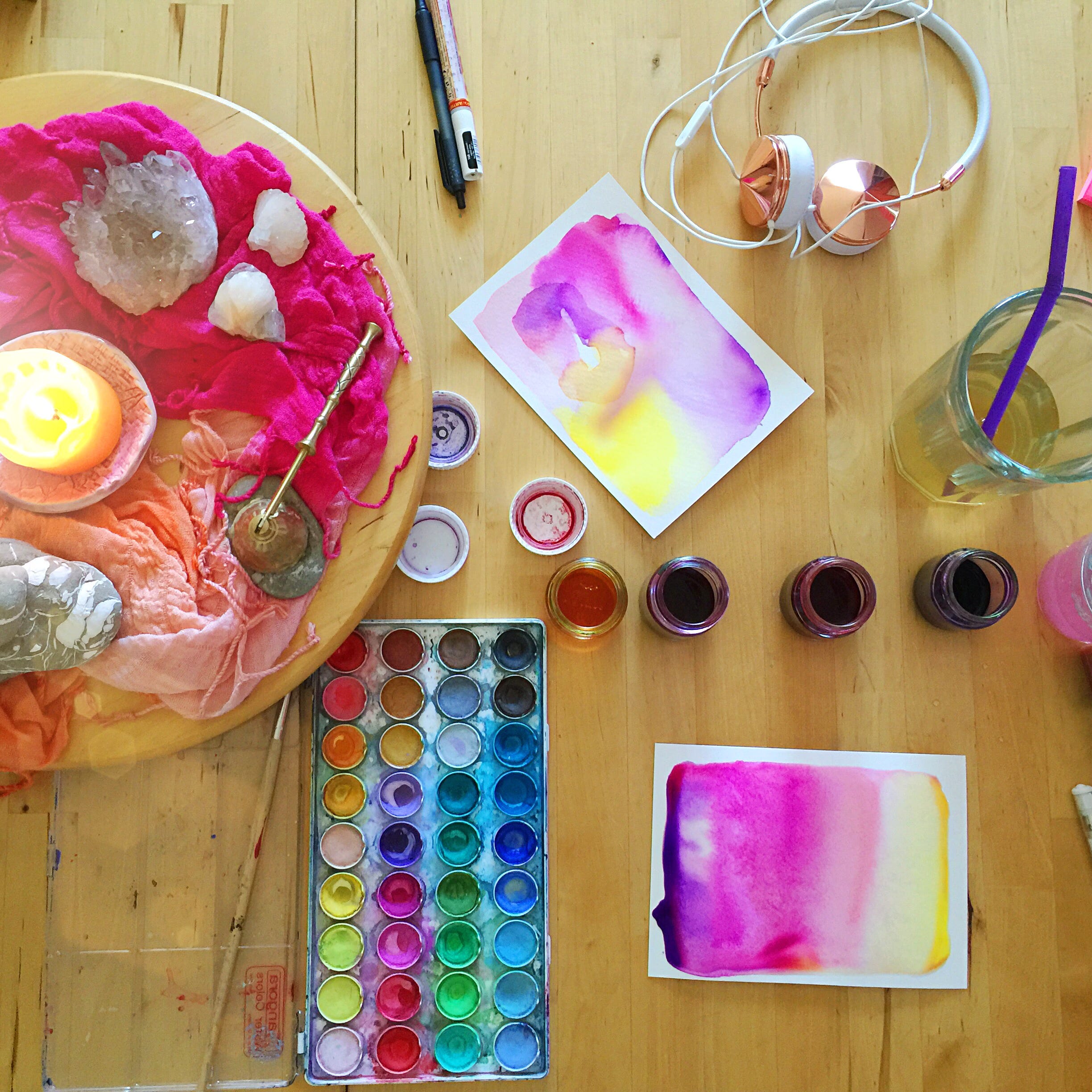 I’m inviting all of us to hang out together (live!) to make something beautiful, because the world needs us to gather, to create, and to be in awe. Being in community (even if virtually) while making something new that has never before existed keeps us in our humanity, in our true nature, and connected to our inner divinity. Plus, watching colors flow together on a page is easy, fun, and friggin’ pretty! Please join me: