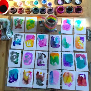 How did this particular flow state happen for me? One sunny day, back in early 2016, I set up a bunch of small pieces of watercolor paper, not knowing where I was headed with the art... just trusting, playing, listening to the materials. No audience in mind, no finished product in mind.