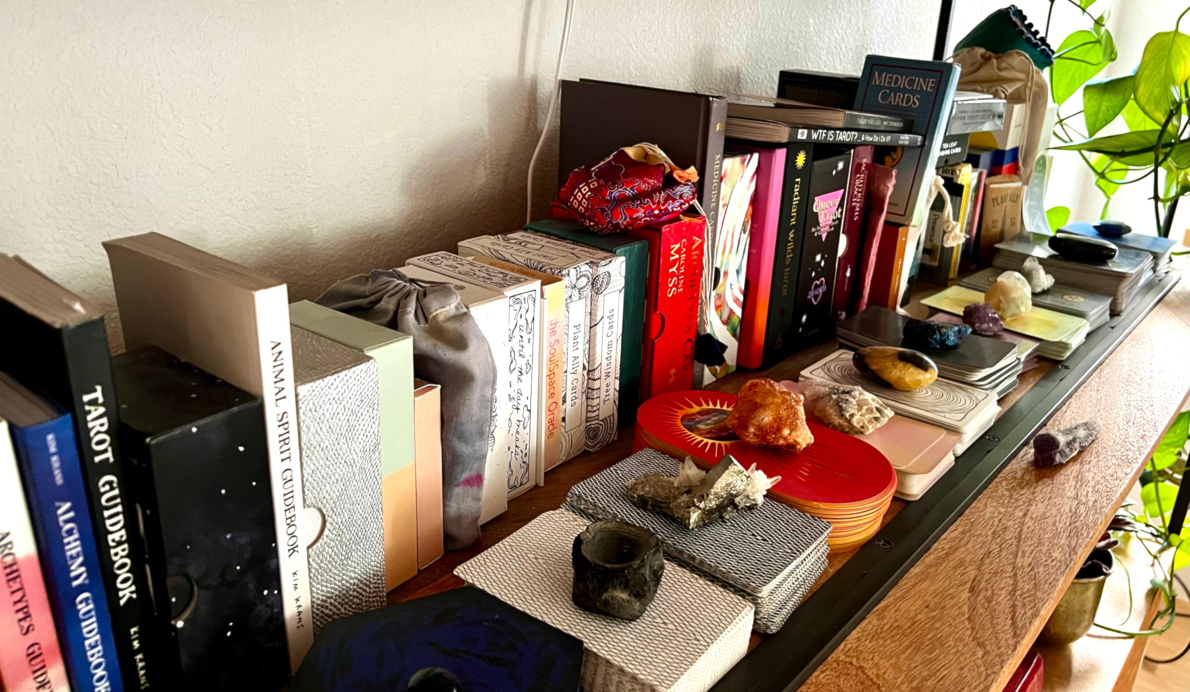 Over the past 36 years, I’ve amassed an embarrassingly large collection of both tarot and oracle decks. I weed through them every couple years to give away the ones that aren’t resonating, so there’s a constant rotation. A handful of decks always survive the periodic cleanse — like many you see in the picture below by Kim Krans, Bakara Wintner, Rider-Waite-Smith, and even one created by my kid when they were nine.
