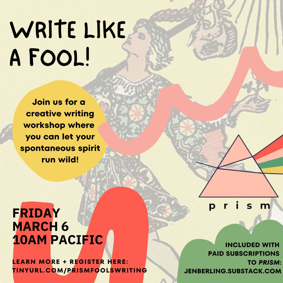 All other live prism events (which happen at least quarterly, and include things like writing and art workshops, talks on midlife, guest speakers, etc.)
